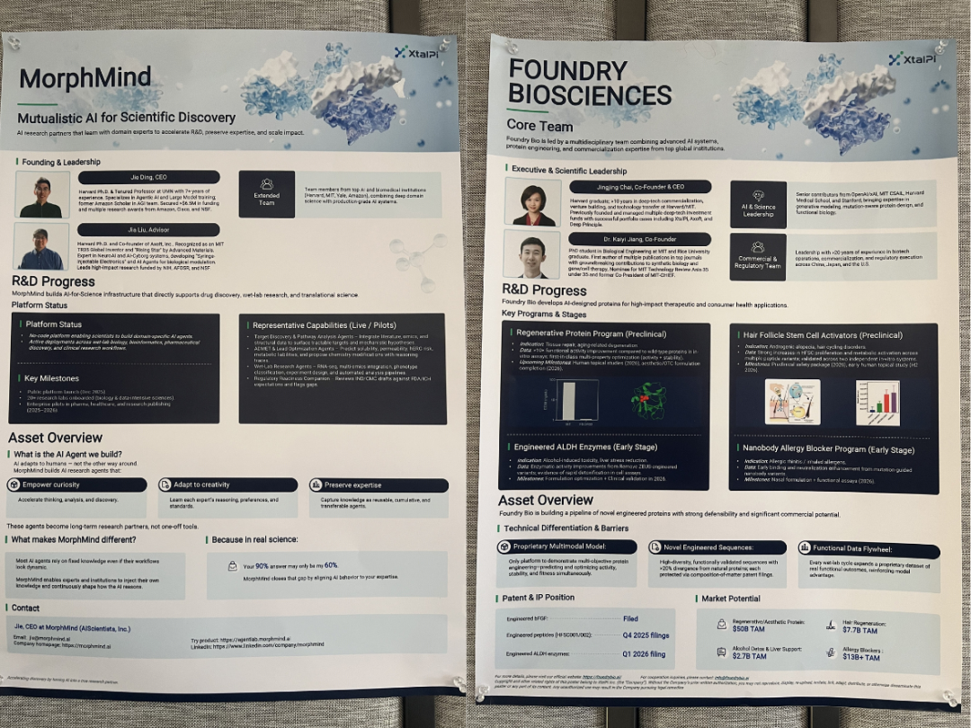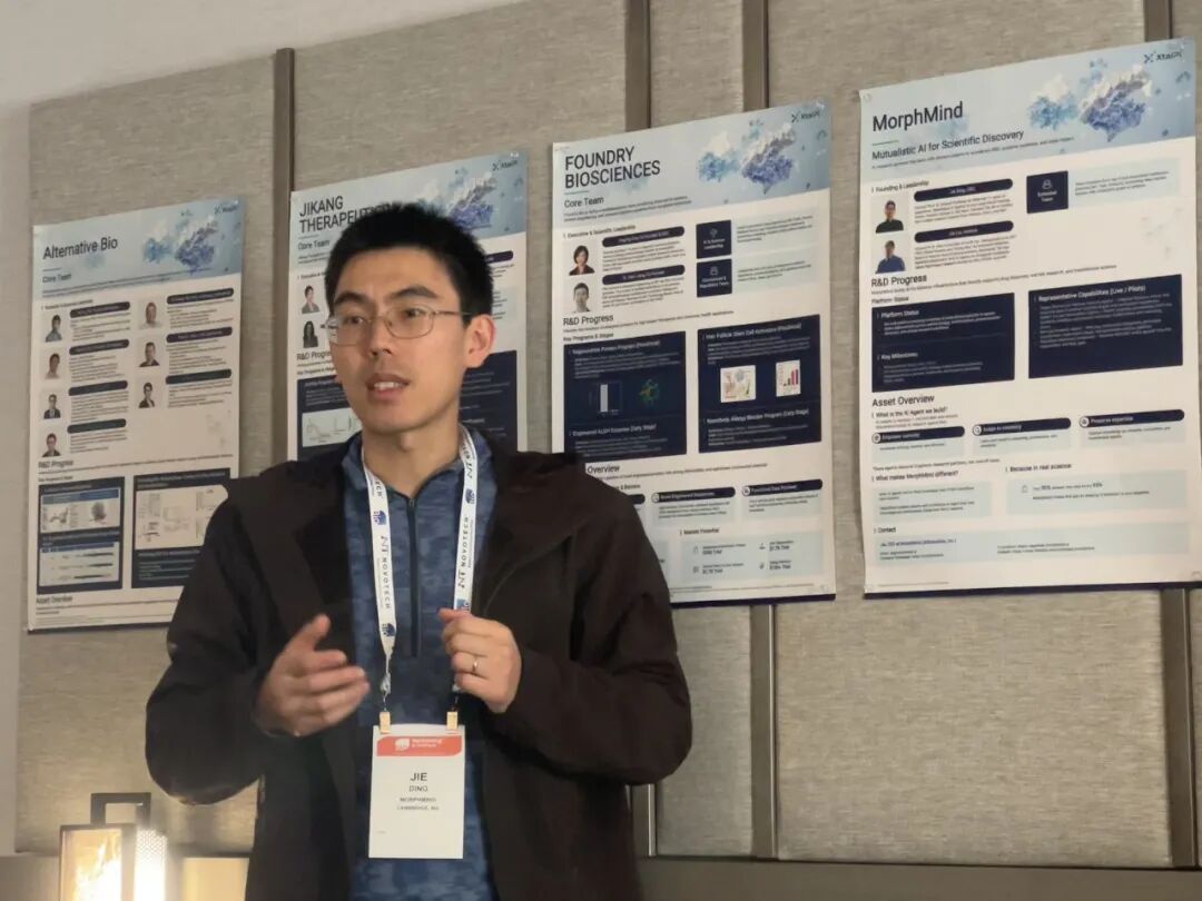晶泰生态圈企业 Morphmind 创始人、CEO 丁杰 & 晶泰生态圈壁报展示(左右滑动查看更多)