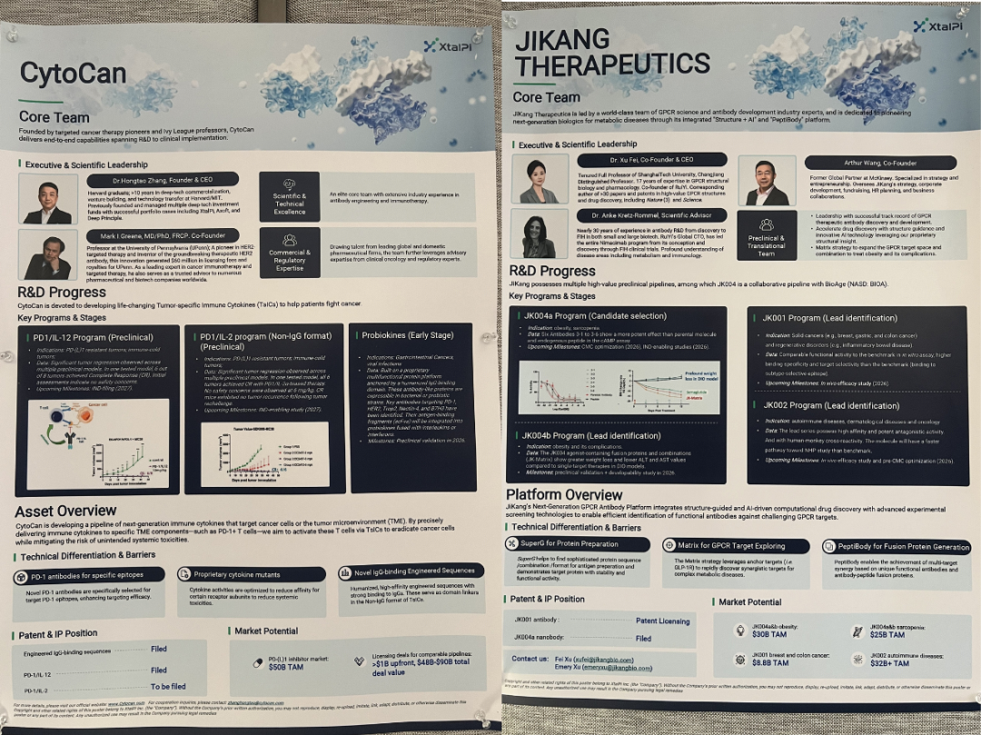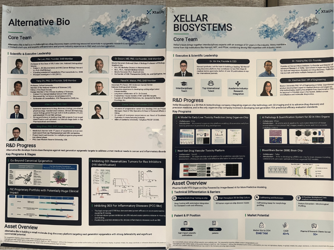 在外部创新生态中,MorphMind的无代码 AI 科研 Agent 平台已赋能 20 余家科研实验室,实现靶点发现、ADMET 预测等全流程智能化;Foundry Bio 凭借 AI 设计蛋白技术,在再生医学、毛发激活等领域取得突破性进展,相关管线即将进入产品化。此外,CytoCan 的肿瘤特异性免疫细胞因子平台、Jikang 的 “结构化+AI” GPCR抗体研发平台、Alternative Bio 的下一代表观遗传靶点药物平台,以及Xellar 融合器官芯片与 AI 的高通量筛选平台,均凭借差异化技术壁垒与扎实研发数据,成为展会焦点。